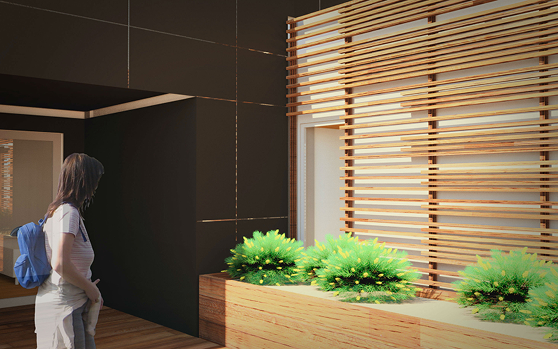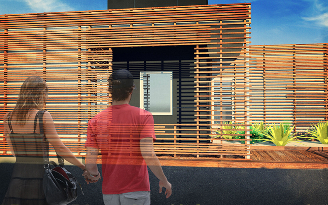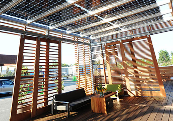 shade screen made from local, sustainably harvested redwood. The screen is denser at the areas