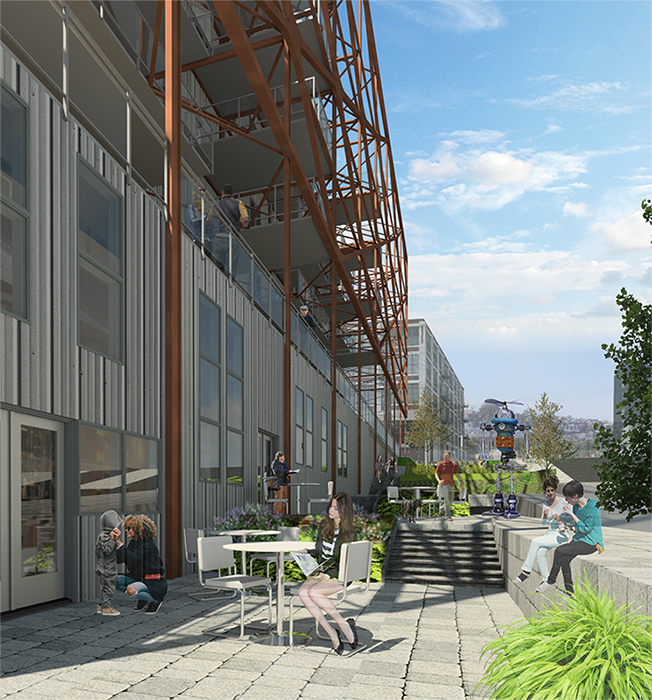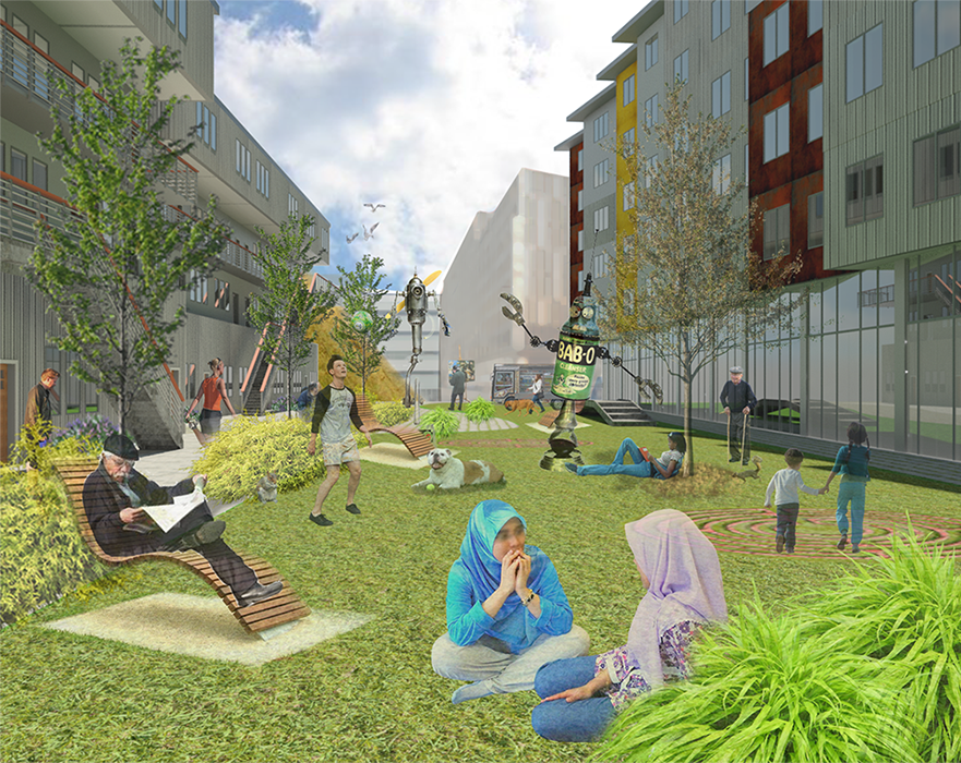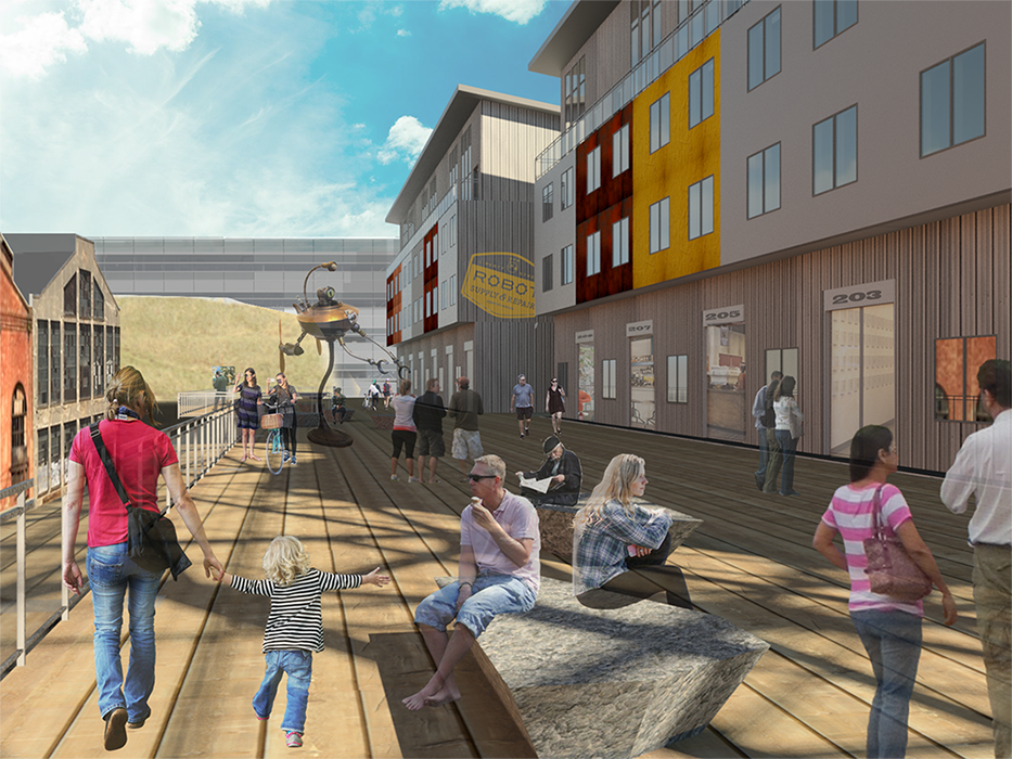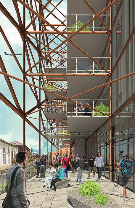 Through my project, I connected the historical features of the site with contemporary building methods. I focused on creating a sustainable and welcoming community with three major open spaces for everyone to enjoy. Each area of open space has a different character. The Courtyard is active with space to work out, play, as well as cool down. Vegetation separates the active portions from the front door of the town homes. The Michigan Walkway is flexible, allowing the artisans in the live-work units to sell their merchandise while also allowing enough room to host a farmer’s market or maker-fair. The Plaza is calm with businesses flowing out onto the terracing platforms. It also connects Michigan and Illinois Street to transition the 20 foot elevation difference.