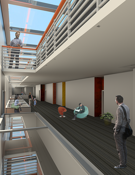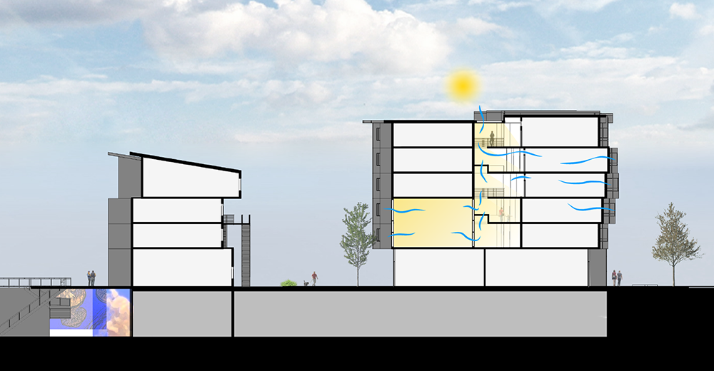 When designing the double-loaded corridor building, I researched ways to create the corridor while still incorporating natural light and stack ventilation. In the heating-dominated climate of San Francisco, natural ventilation can eliminate the need for air conditioning. To comply with codes, only two stories are connected before a fire-rated skylight is placed. In summer, the skylights can remain open so that when residents open their clerestory windows on the corridor side and windows on the street side, they can take advantage of stack ventilation. The skylights are opened with magnetic hold-open hardware like fire doors so that in an emergency, they close. In addition to light from the skylights above, light reaches the lower levels from the side at the double height community areas which are thoughtfully placed throughout the project. In winter, the passive heat gain at the community spaces reduces the heating load. The result is a wider corridor with lounge spaces and natural light coming together to create a pleasant place to live.