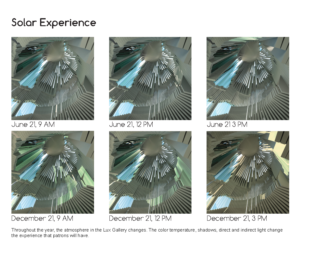This project explores how architecture can balance creating an innovative space for artists to respond to without overpowering the work on display. The galleries are dynamic to give artists and patrons a different experience depending on conditions like light and temperature. These conditions break away from the conventional galleries to provide a new experience.